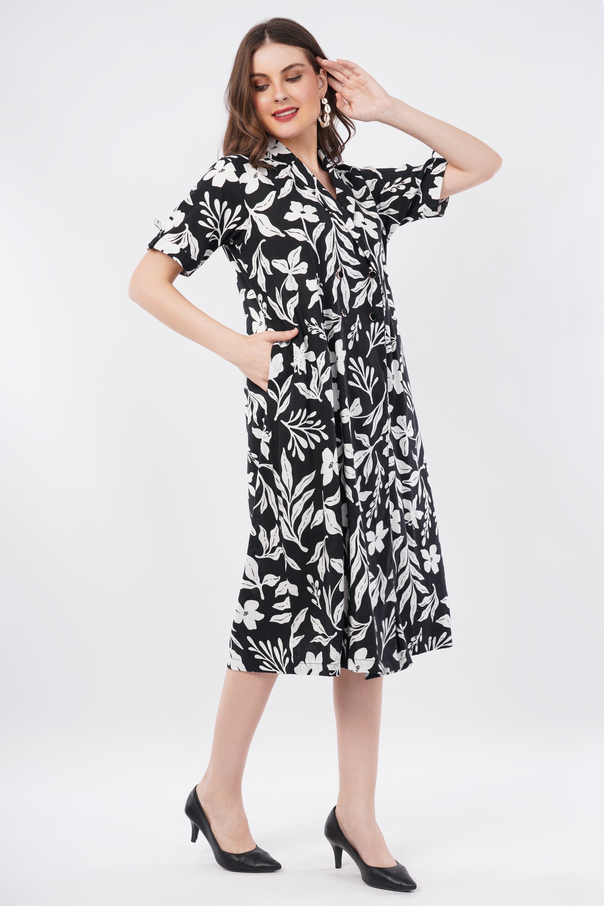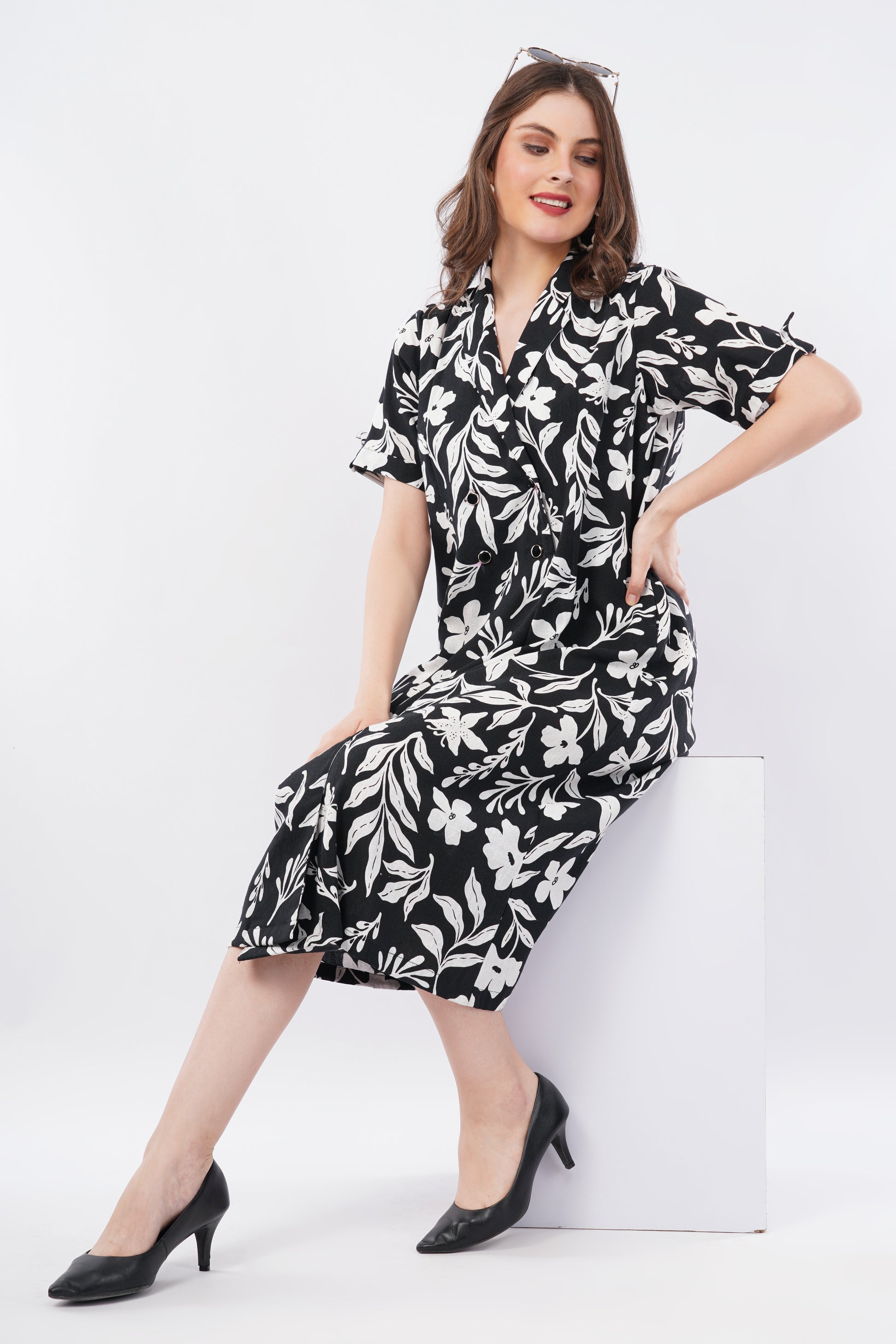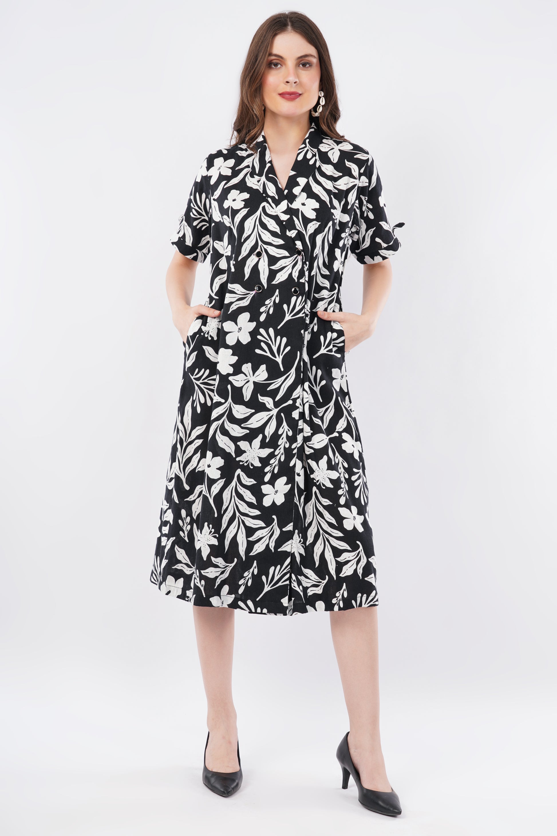 Step into effortless elegance with this double-breasted coat-style dress, perfect for everything from brunch dates to boardroom meetings. Crafted in a breathable, comfort-first fabric, it features striking geometric motifs in mustard and indigo on a classic black base. The structured collar and functional pockets add just the right touch of utility and charm. Pair it with heels or sneakers—this dress transitions seamlessly from day to night. A true wardrobe hero for the woman who loves power dressing with personality.