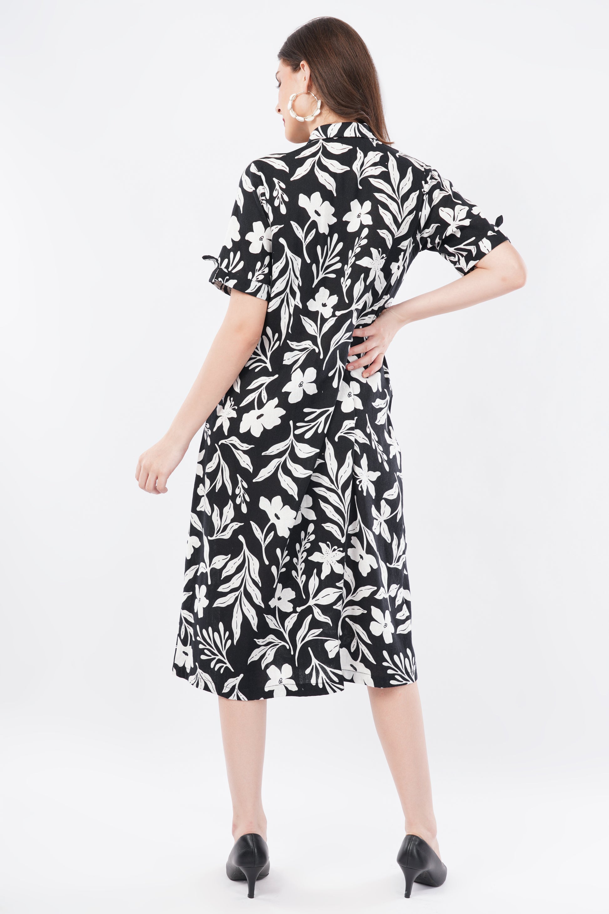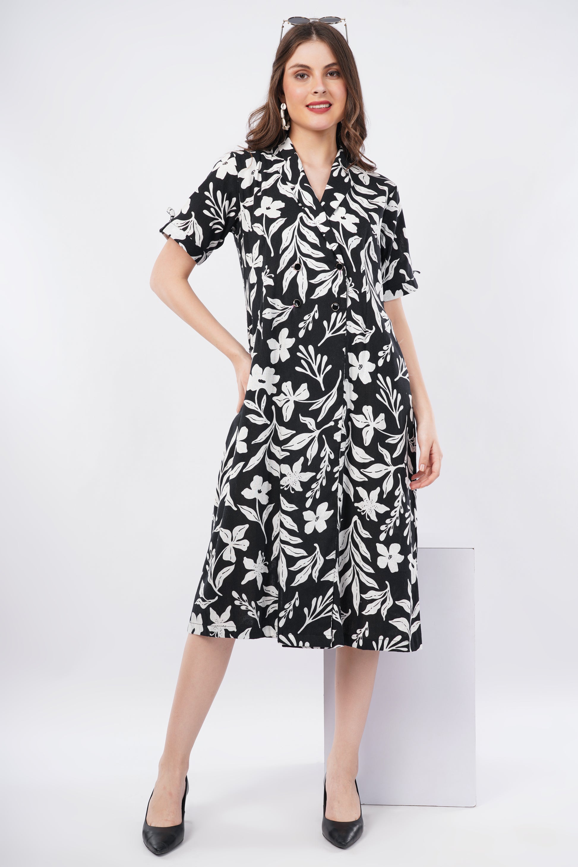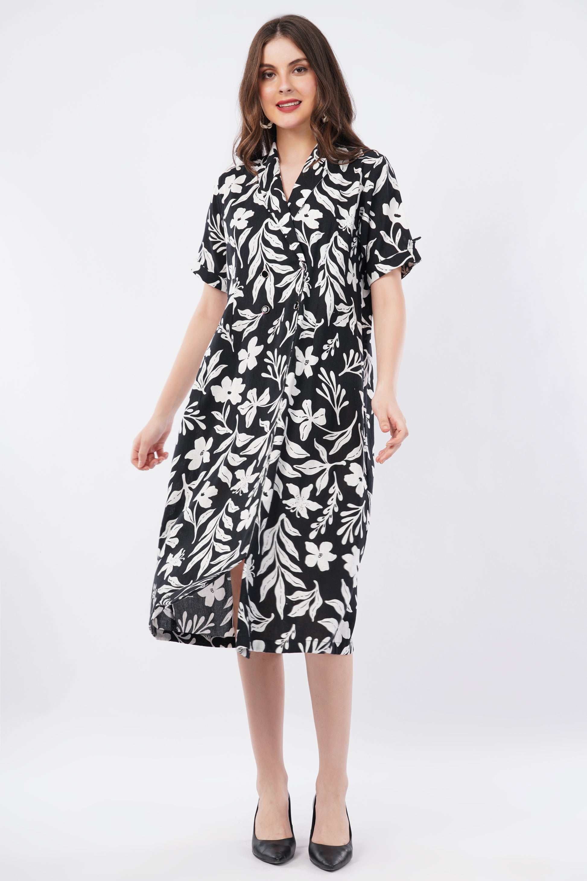 Step into effortless elegance with this double-breasted coat-style dress, perfect for everything from brunch dates to boardroom meetings. Crafted in a breathable, comfort-first fabric, it features striking geometric motifs in mustard and indigo on a classic black base. The structured collar and functional pockets add just the right touch of utility and charm. Pair it with heels or sneakers—this dress transitions seamlessly from day to night. A true wardrobe hero for the woman who loves power dressing with personality.