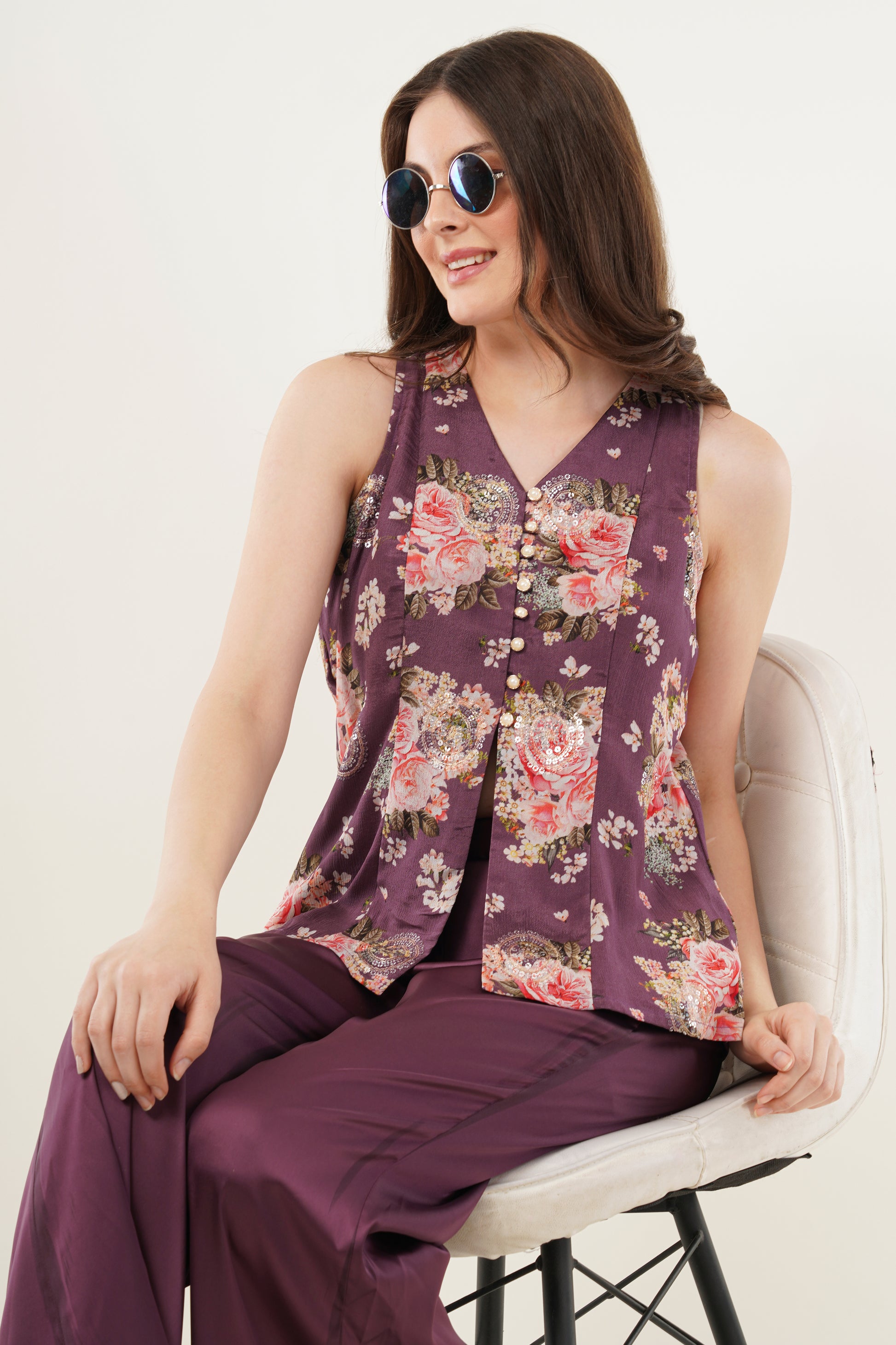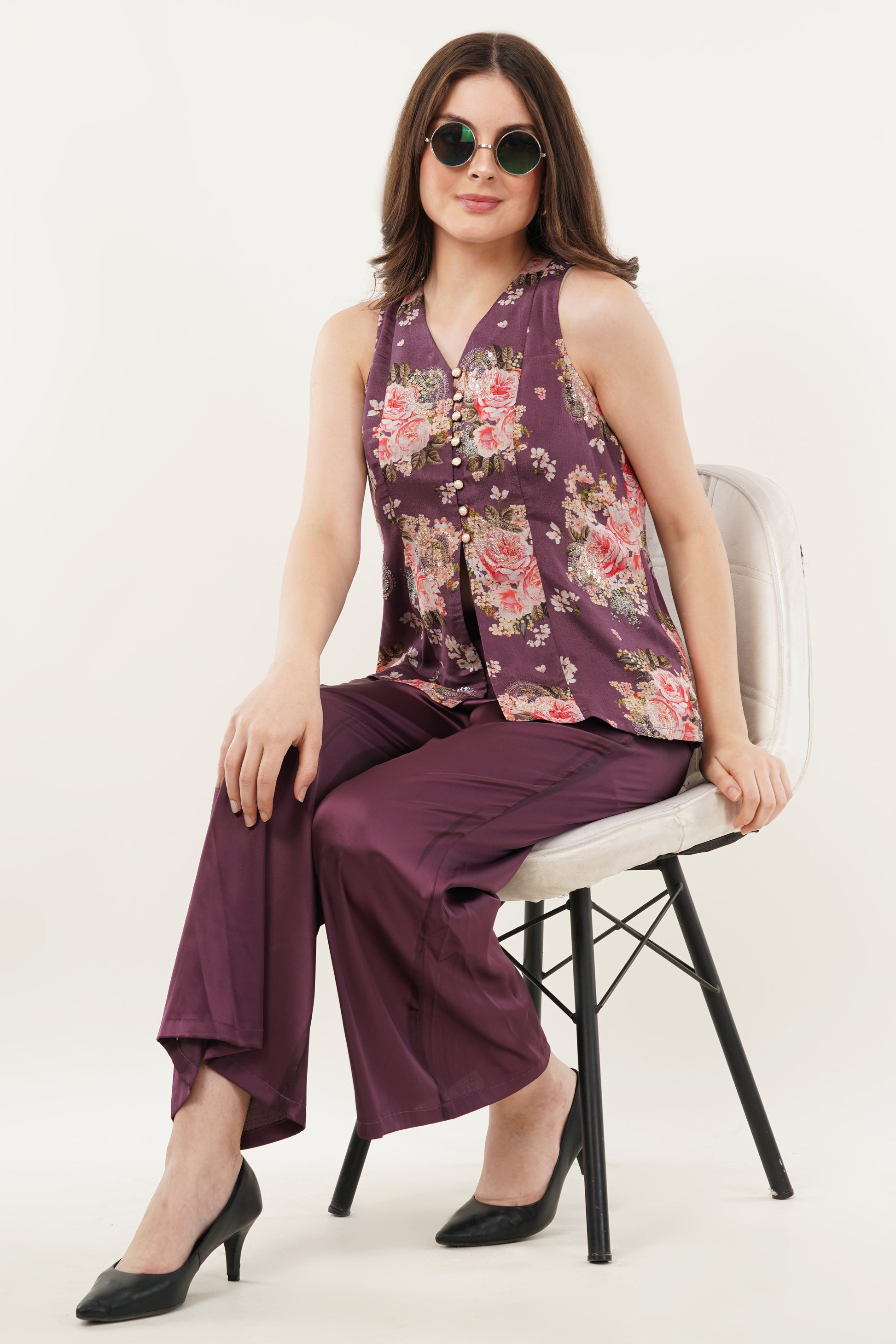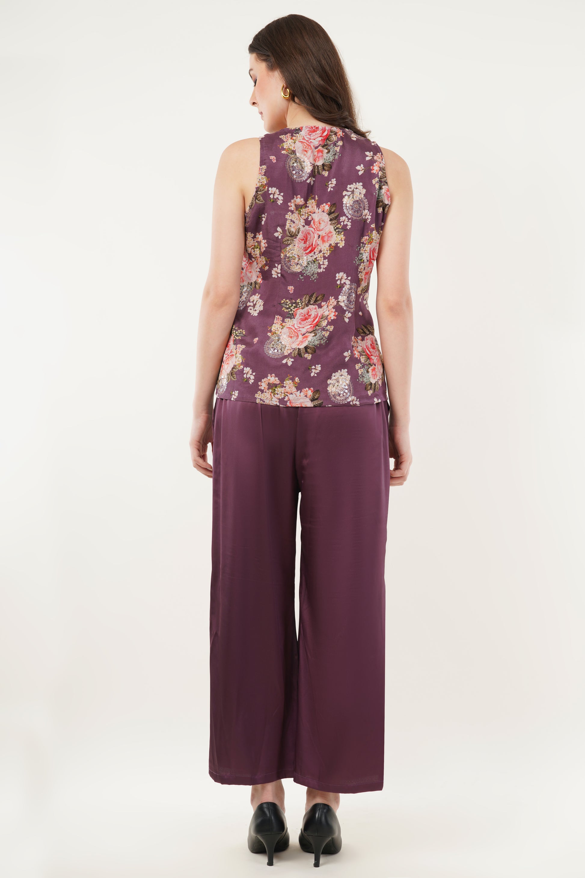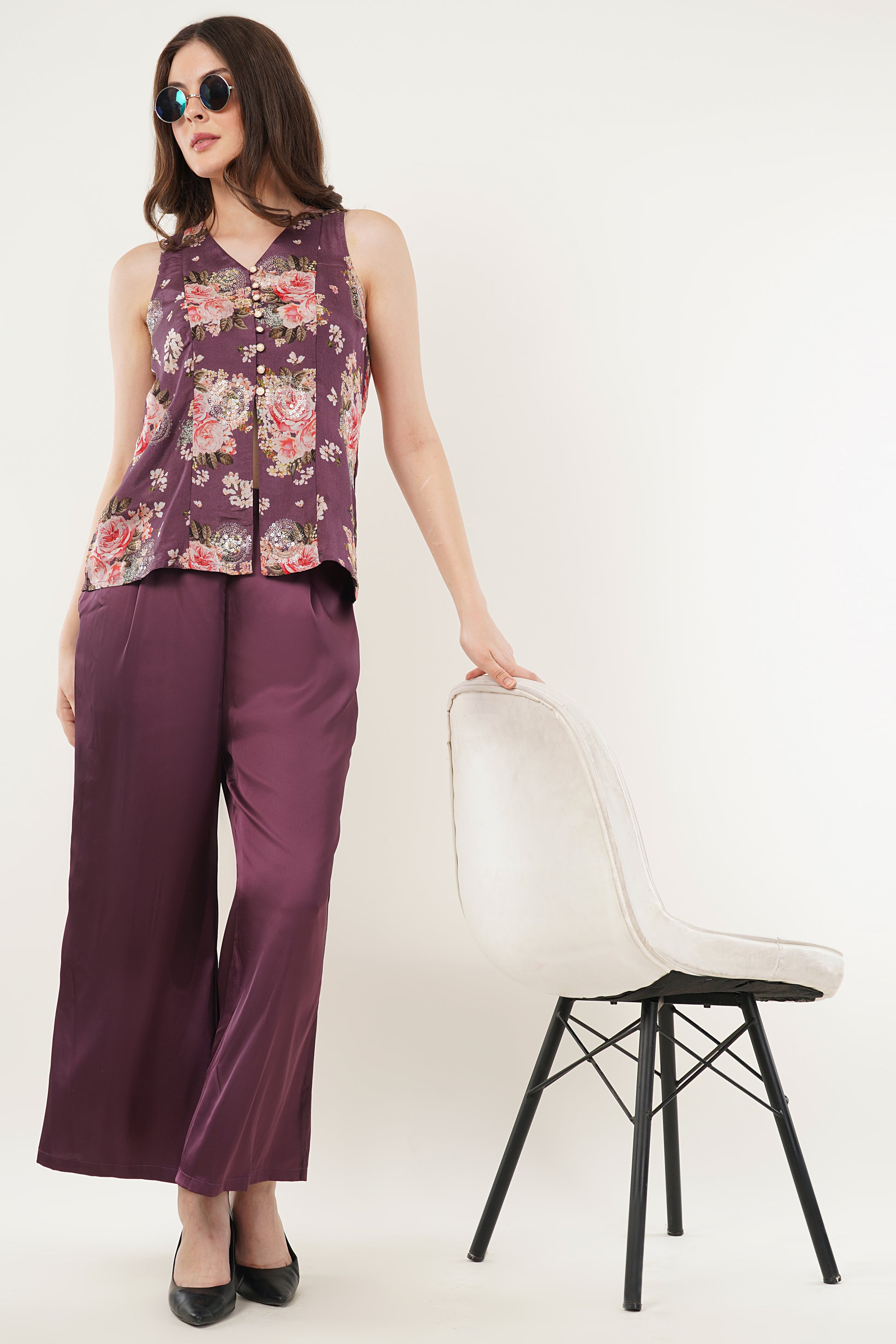 Fabric: Printed crepe with sequin detailing upper and satin palazzo.