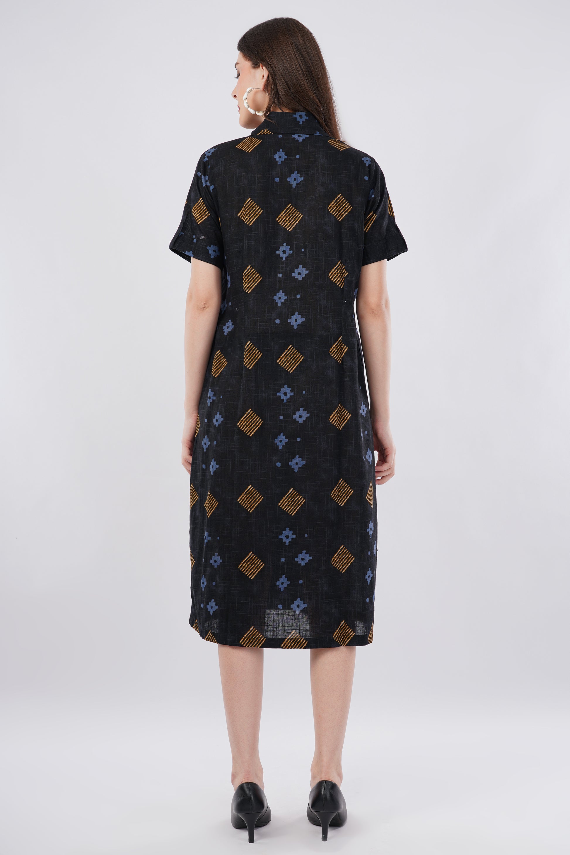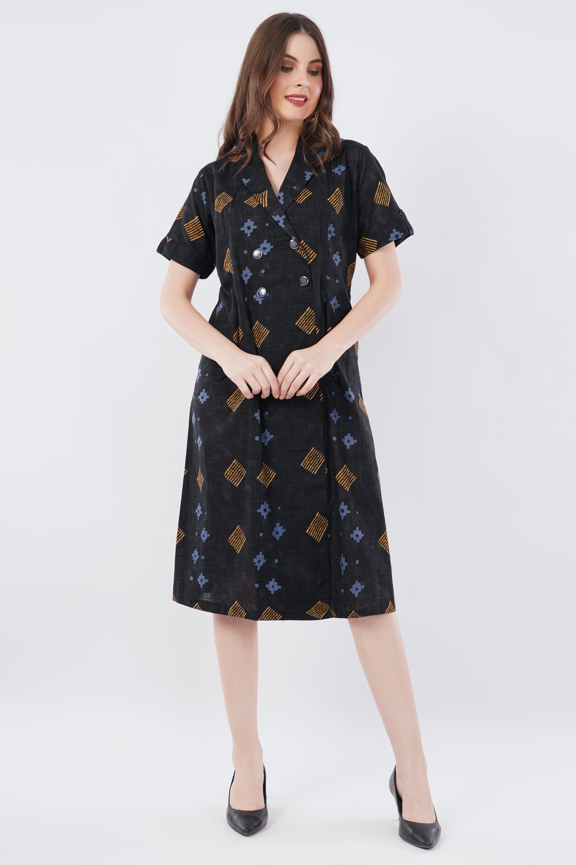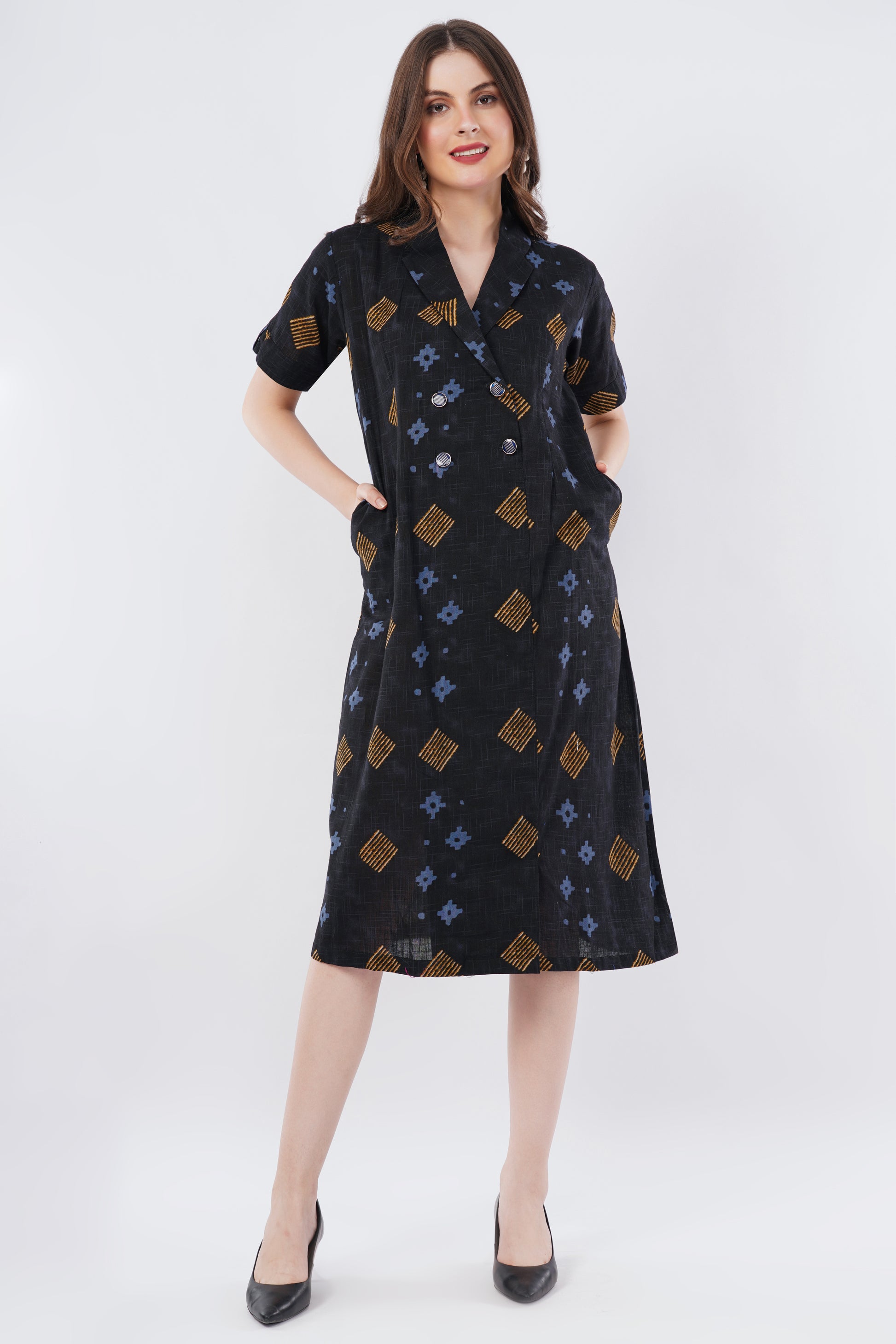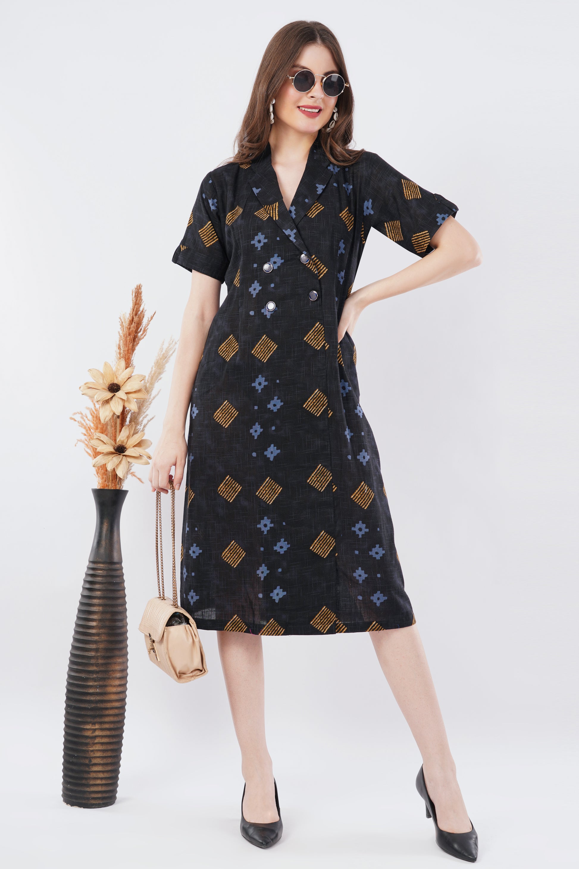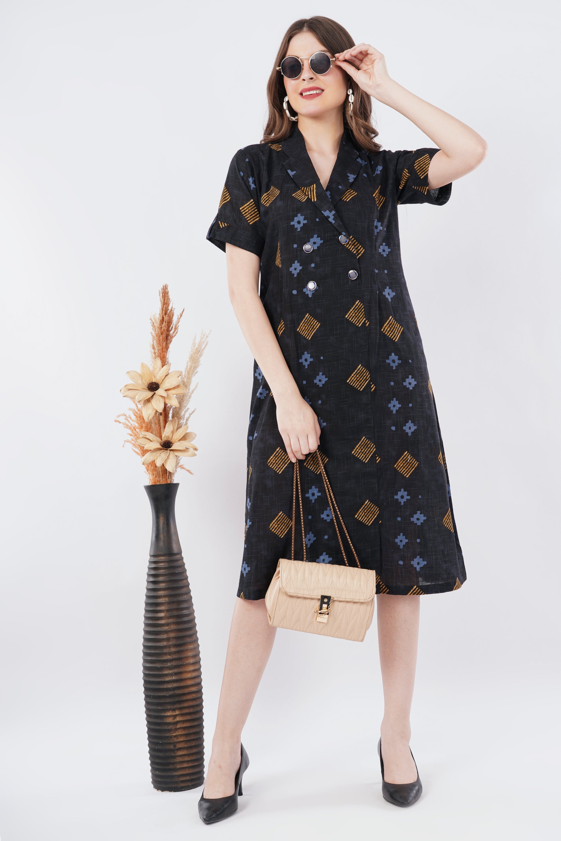 Breezy yet bold, this black and white floral coat-style dress is your perfect pick for casual Fridays or weekend brunches. With a relaxed silhouette, soft fabric, and practical pockets, it combines comfort with effortless flair. The monochrome floral print adds a fresh twist to your everyday style. Pair it with pumps or flats for a chic, no-fuss look. A timeless staple for the modern wardrobe.