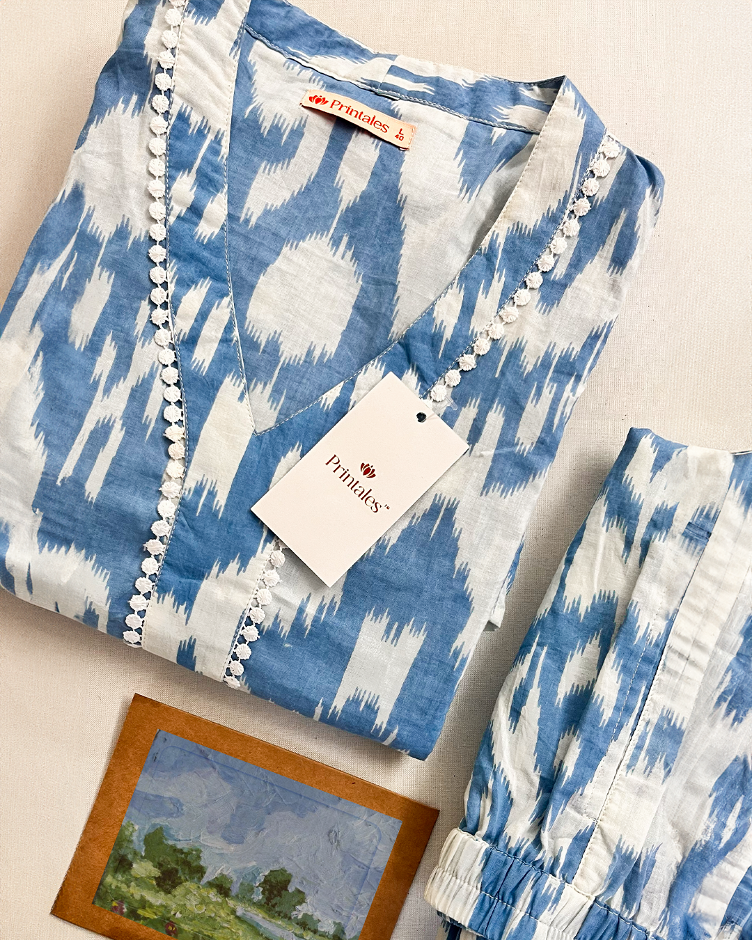 Elevate your wardrobe with our Ikat-printed cotton co-ord set, featuring delicate lace detailing and crafted from breathable fabric for ultimate comfort. Designed for effortless style and versatility, this ensemble is perfect for casual outings or relaxing days.
