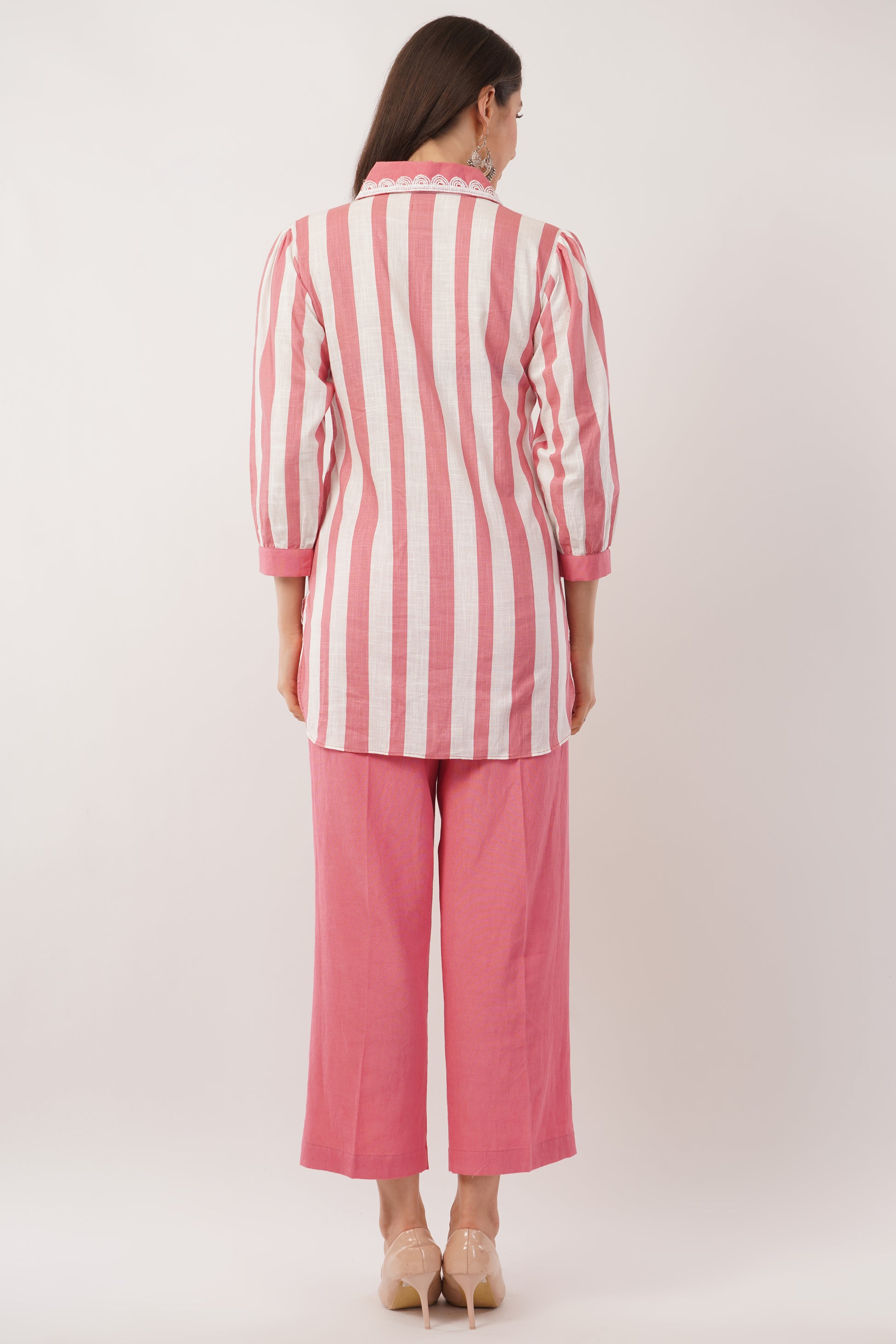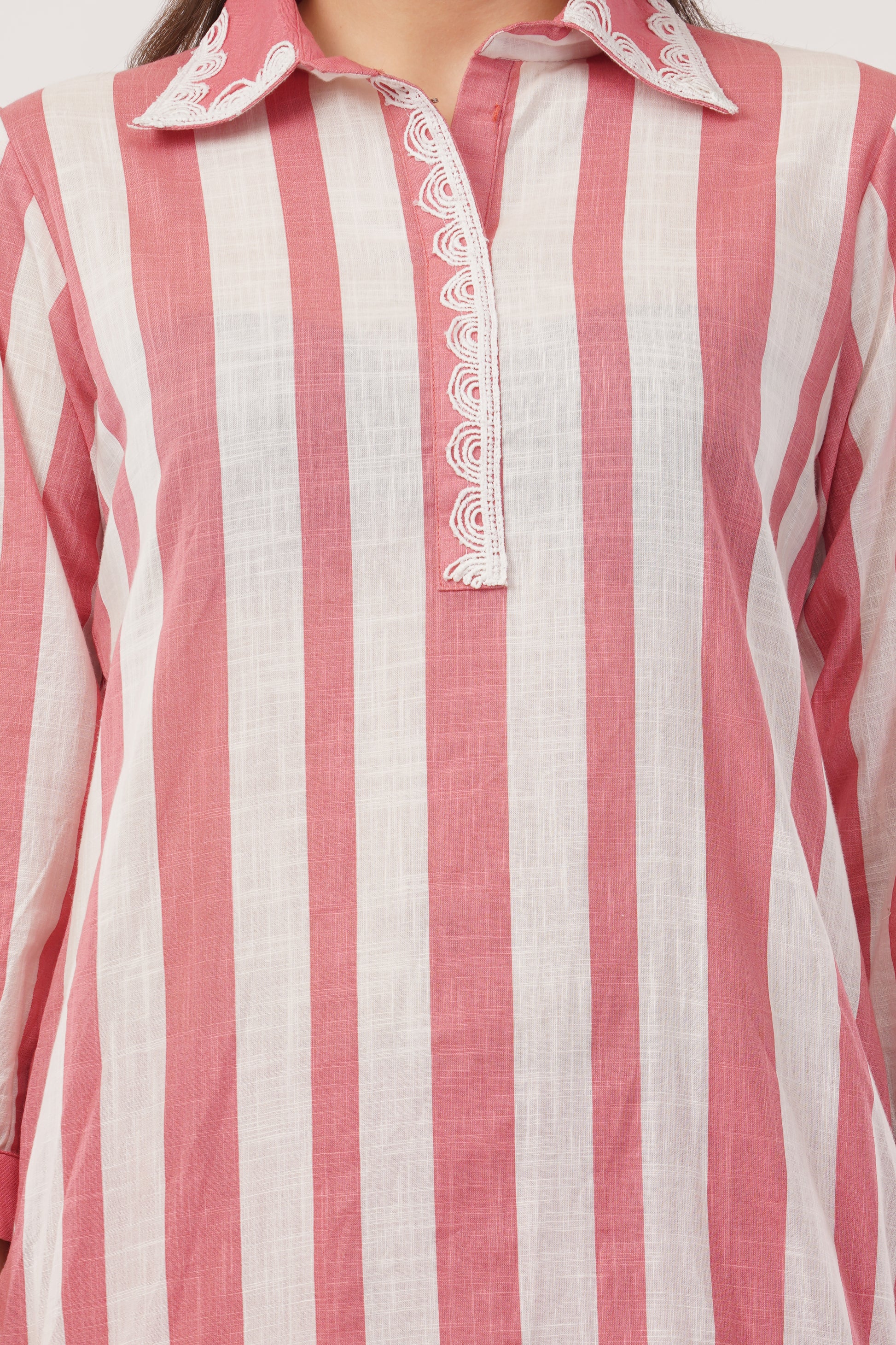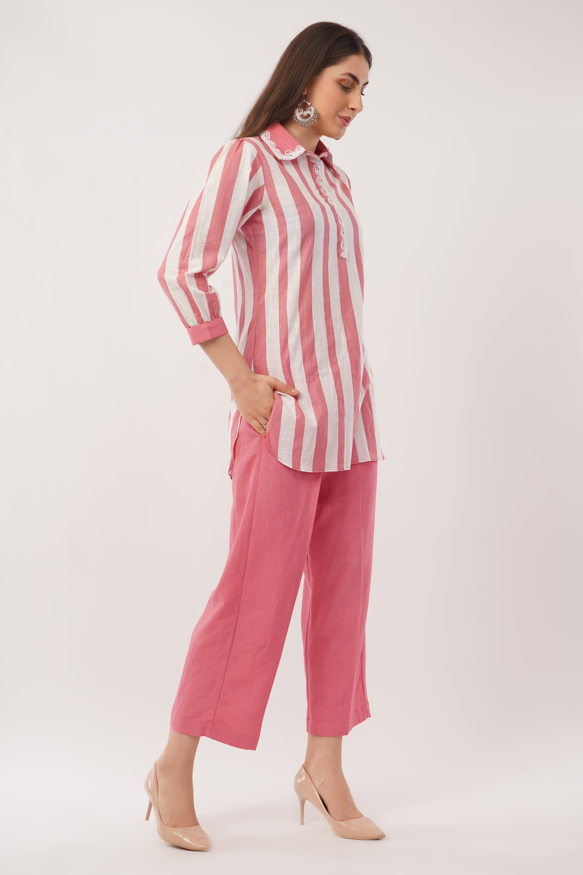 Elevate your everyday style with this effortlessly chic Striped Cotton Kurta Set. Crafted from premium breathable cotton, this ensemble offers unmatched comfort while ensuring a polished look. The kurta features bold vertical stripes that create a sleek and elongated silhouette, complemented by delicate lace detailing on the collar and placket for a touch of elegance. The relaxed fit and curved hemline provide ease of movement, making it perfect for both casual outings and workwear. Paired with cotton pants, this set balances structure and softness, giving you a refined yet easygoing appeal. Style it with statement earrings and nude heels for a timeless, sophisticated look.