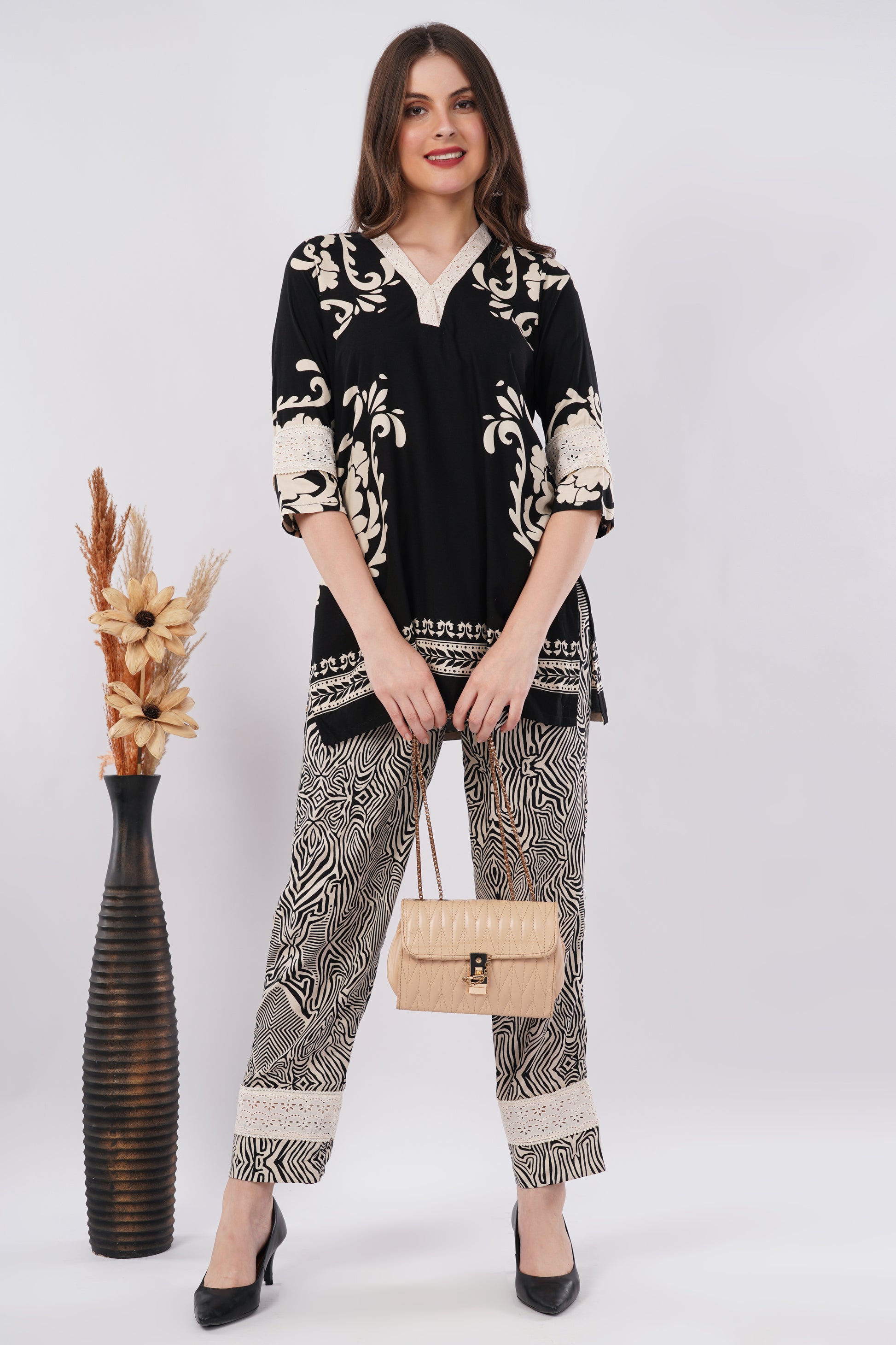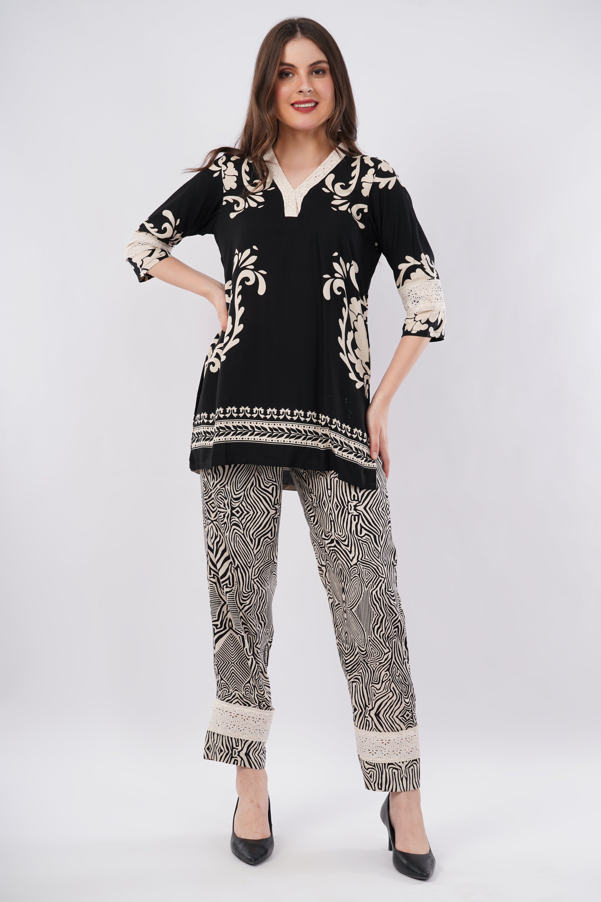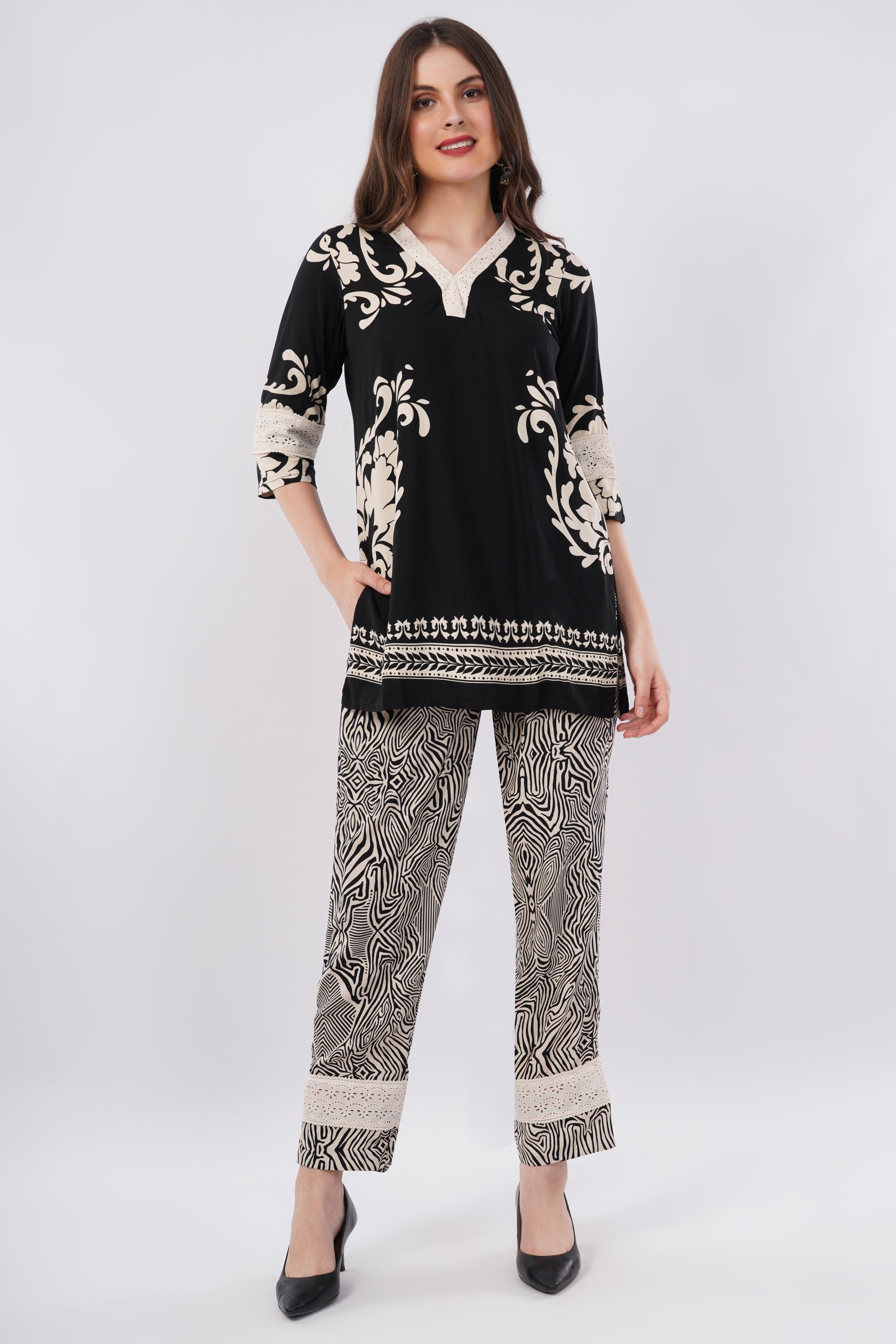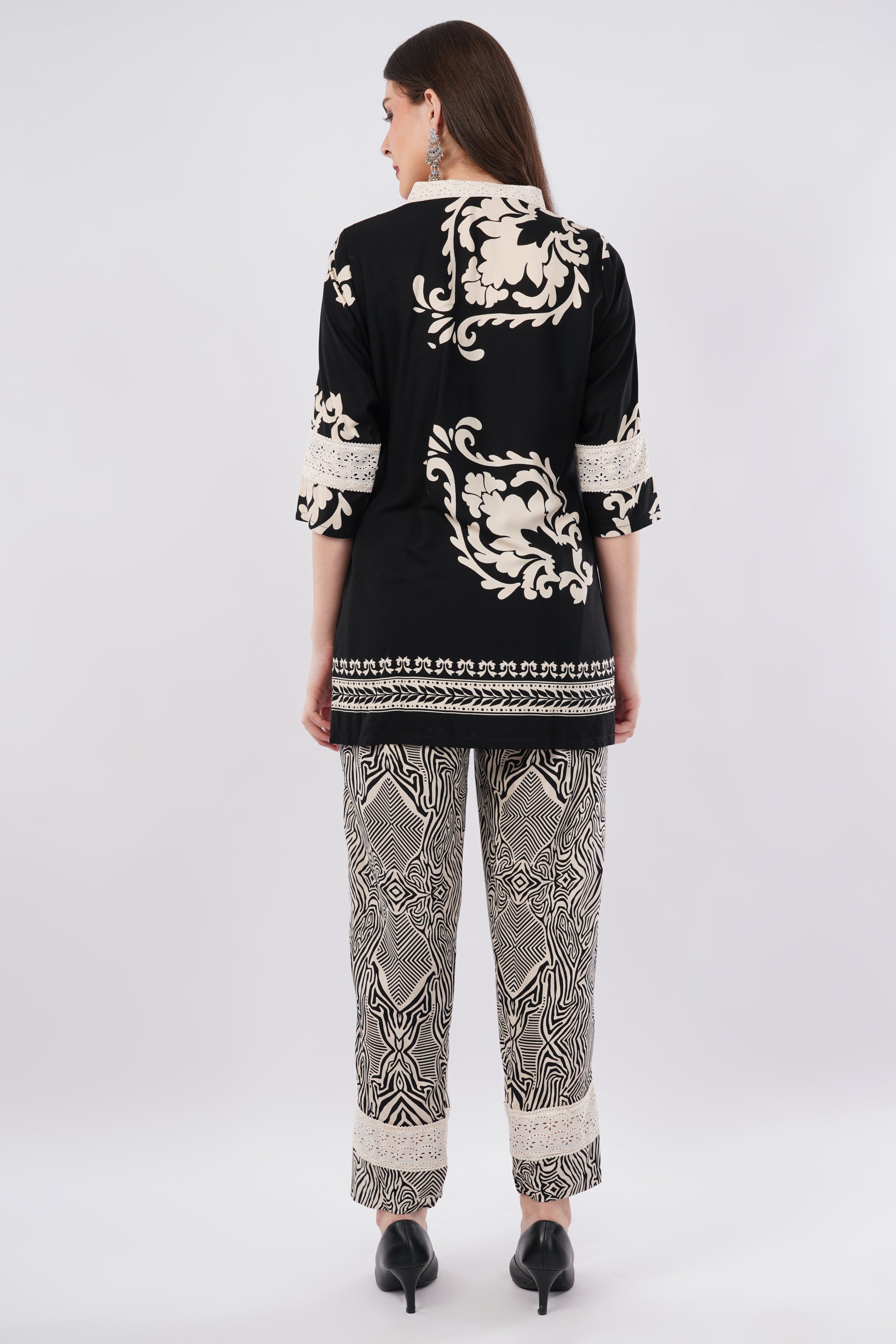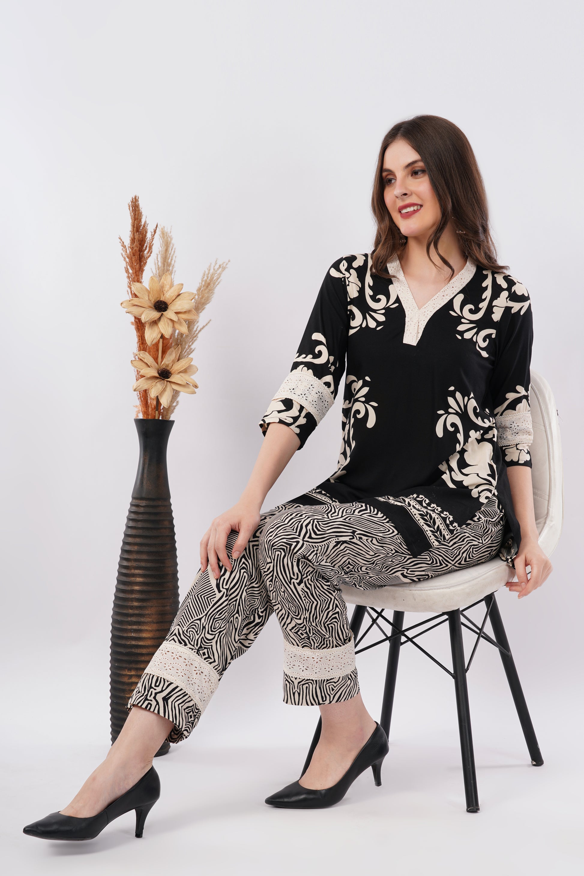 A perfect fusion of bold and graceful. The black kurta is adorned with intricate ivory patterns and delicate lace accents on the neckline and sleeves, exuding timeless sophistication. Paired with striking abstract-printed trousers featuring lace-detailed hems, this set brings together comfort and contemporary charm. A versatile choice for chic daywear or elegant evenings.