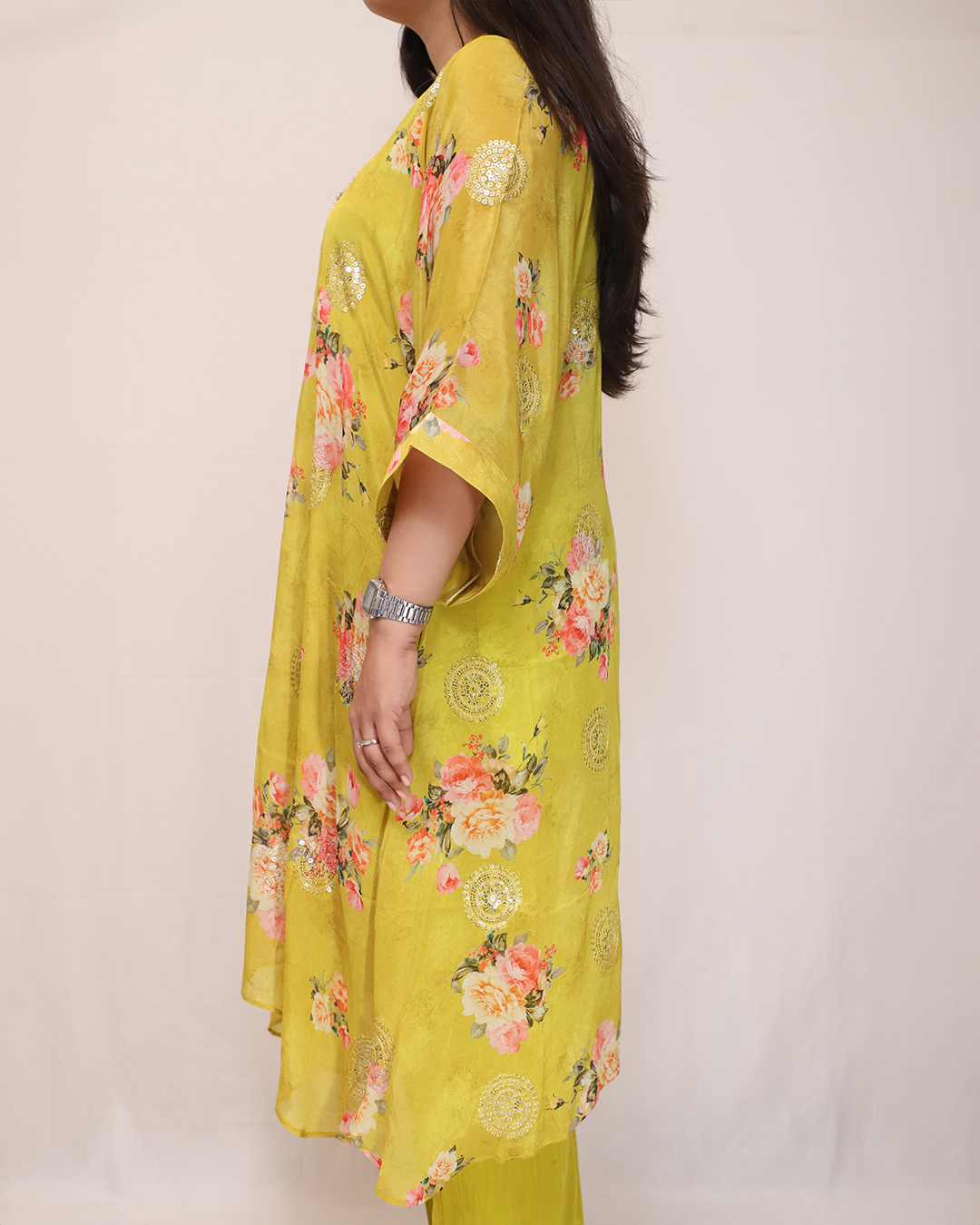 Elevate your everyday wardrobe with this breezy kaftan suit set. Featuring a flowy silhouette, vibrant floral prints, and delicate lace detailing, this outfit is perfect for a blend of comfort and elegance."